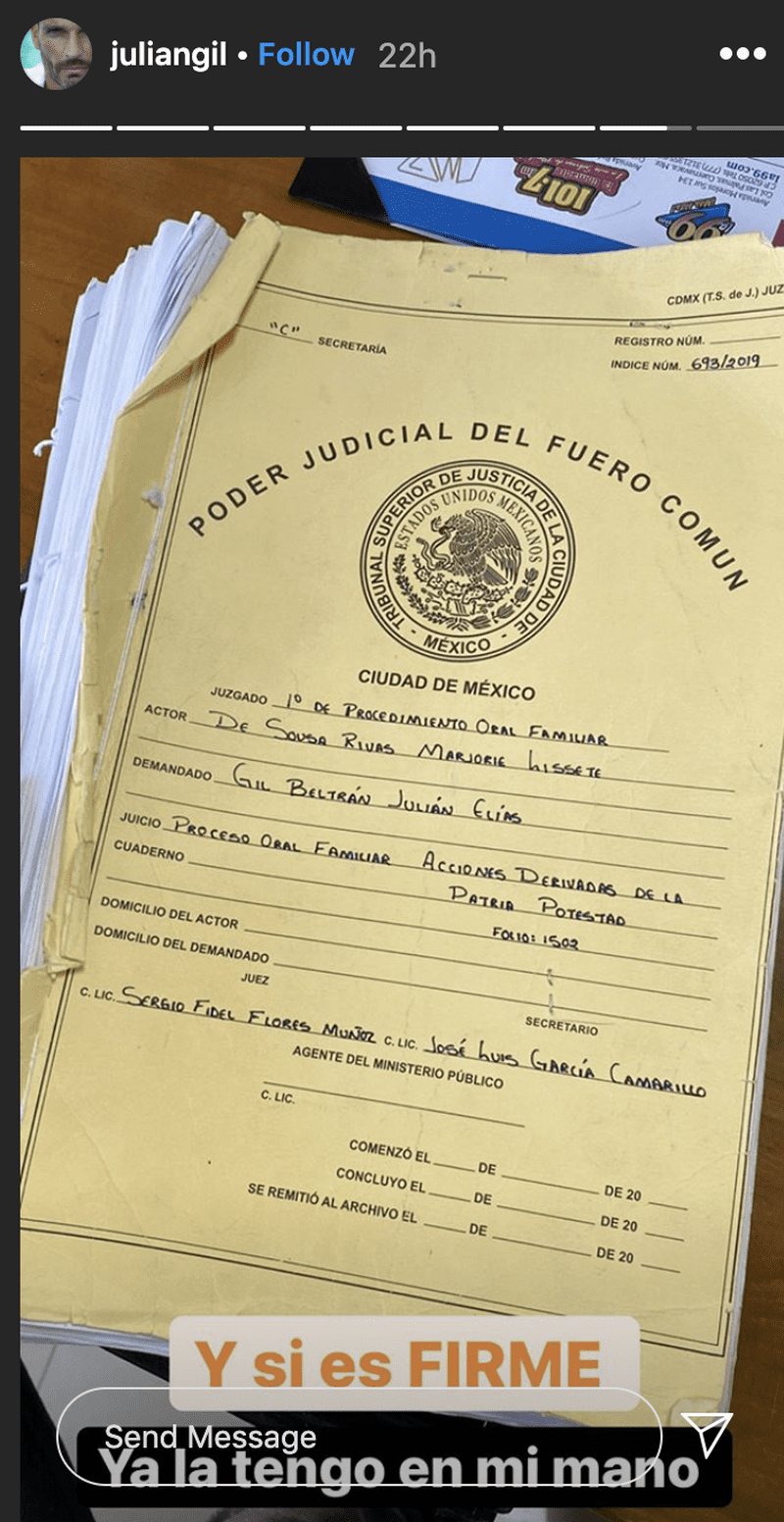 Pe 22 octombrie, Julian Gil s-a dus la judecătoria din Ciudad de Mexico pentru a obține dosarul acestui caz. Vizibil deranjat de declarațiile fostei partenere, Julian i-a adus o serie de acuzații pe rețelele de socializare: